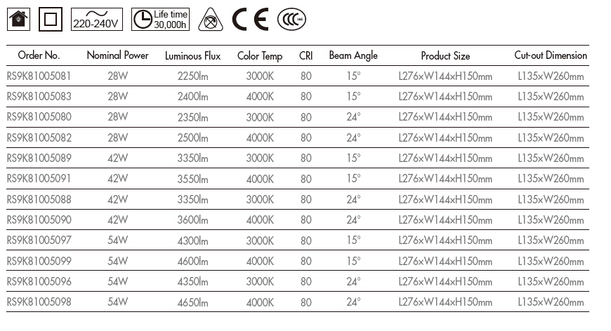 Featured with COB modular design, cold forging processed heat sink, low-glare, adjustable angle aiming for various applications. RS9K Series COB Recessed spotlight can be widely used in commercial center, department store, window display, show room etc. for accent lighting.